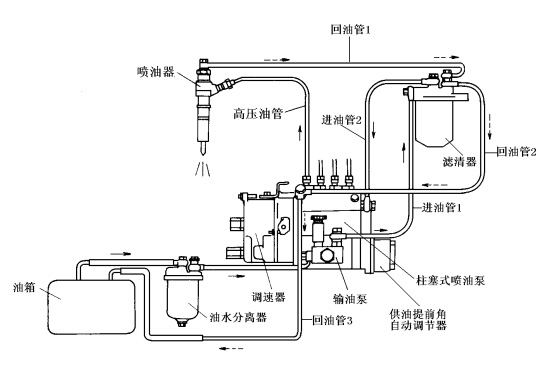 柱塞式噴油泵一般由柴油機曲軸的正時齒輪驅動。固定在噴油泵體上的輸油泵由噴油泵的凸輪軸驅動。輸油泵從油箱中吸油經管路壓入高壓泵,高壓泵提高壓力后送入噴油器,噴油器將油噴入氣缸。油的流動路線如下: