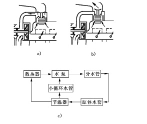 發動機的水循環路線如圖16所示,發動機溫度較低時(低于83℃左右,不同發動機數據有差異),主閥門關閉(圖16-a),旁通閥門開放,冷卻水只能經小循環水管直接流回水泵的進水口,然后又被水泵壓入分水管進入水套。此時,水不流經散熱器,稱小循環(圖16-c)。水流路線是:節溫器→小循環水管→水泵→分水管→缸體水套→節溫器。